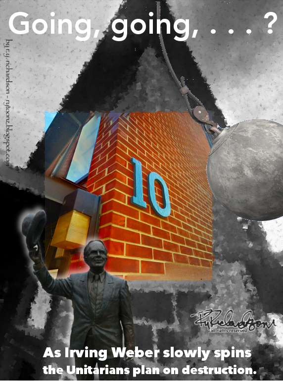 Robert Richardson, "Unitarians missing a sense of place," Iowa City Press-Citizen, March 19, 2015, p. A5 ("Irving Weber must be spinning in his grave as this city continues to tear down its historic buildings. . . . I am disappointed by the callous nature of several [UUSIC]members’ remarks regarding the building’s eminent demise. One long-term member said, 'If they have a bonfire, I’ll bring the matches.' A staff member said, 'If anyone wants to preserve the building, they are welcome to move it.' The Unitarians like to recite their history as dogma. The date of the Society’s founding is always part of every service. Well-known historical figures who were Unitarian are always mentioned. But, a sense of place is not on the agenda. Unfortunately, one is only allowed to tear down a 107-year-old building once.") And see,